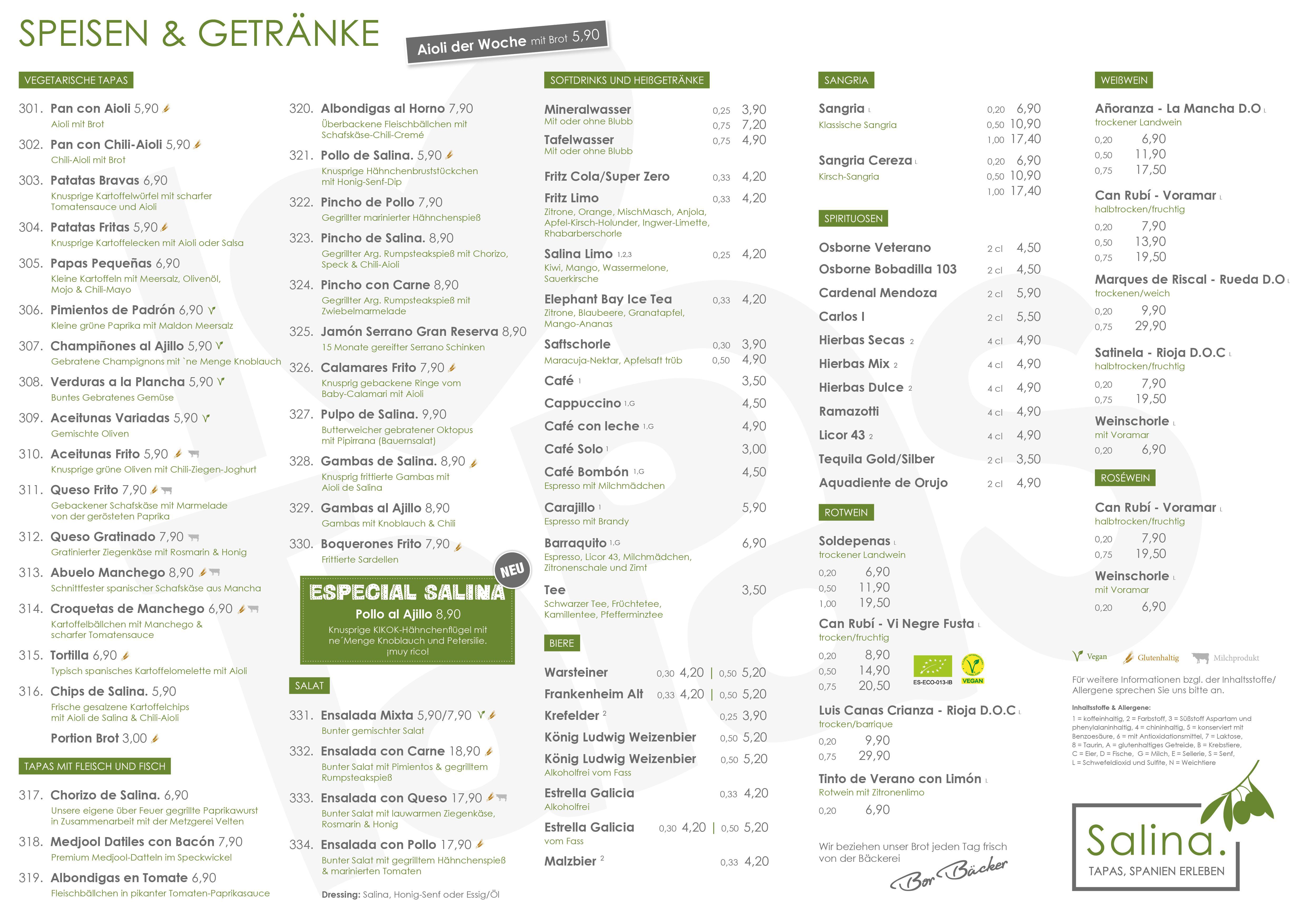 Zusätzlich überraschen wir euch jede Woche mit neuen, kreativen Tapas auf unsere wechselnden Tapas-Wochenkarte – lasst euch inspirieren und entdeckt immer wieder neue Geschmackserlebnisse.